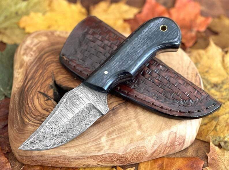 Handmade Damascus steel cowboy skinner knife overall length 8″inch handle made of dollar black wood hold edge and Comfortable handle comes with leather sheath.