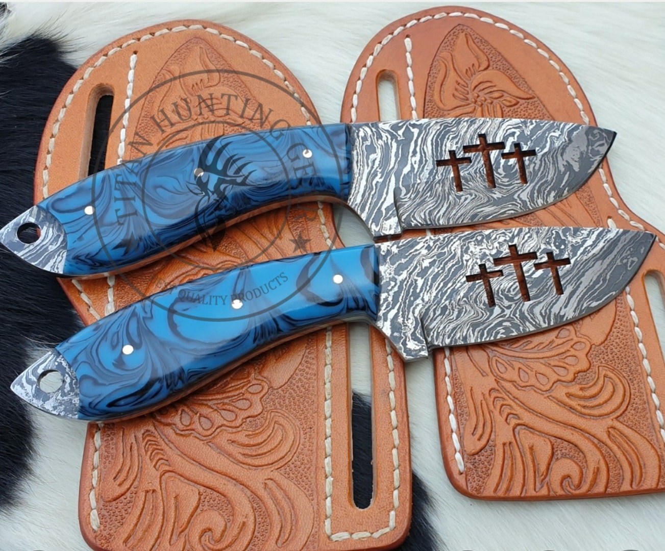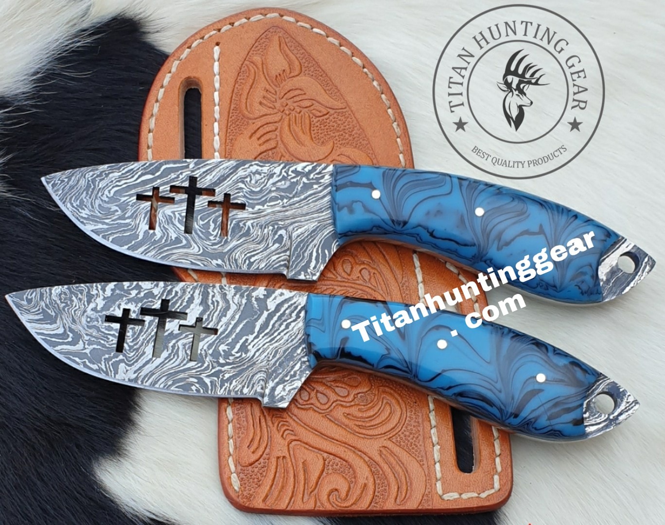 Custom made Damascus steel cowboy skinner knife overall length 8″inches Handle made of Risen shrap edge and still long time comes with leather sheath.