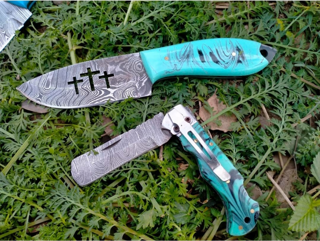 Handmade Damascus steel cowboy Folding and skinner Knifes set overall length 8″inch Folding Knife 7.5″inche Handle made of Resin hold edge and comfortable handle comes with two leather sheaths..