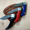Handmade Damascus steel two folding knives set overall length 8″inch handle made of Resin and colour bone holds the edge and comfortable handle comes with leather sheaths.