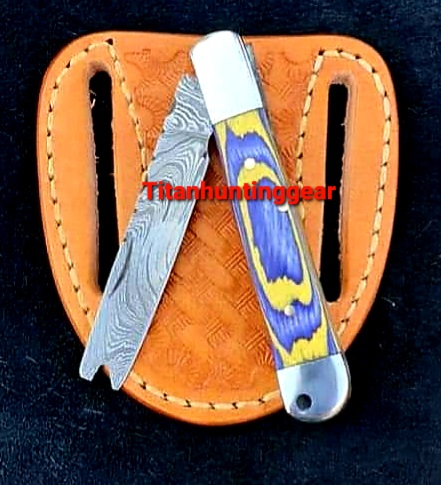 Custom handmade Damascus steel cowboy folding knife overall length 7.5″inch handle made of dollar wood Sharp edge and still long time comes with leather sheath…